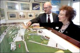 Havnedirektør Bjarne Mathiesen studerer sammen med en af museets frivillige en model af Aarhus havn, som den så ud i 30'erne
