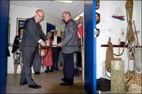 Havnedirektør Bjarne Mathiesen foretager den officielle åbning af Aarhus Søfarts Museum, bistået af museets formand og daglige leder Karl Nøhr Sørensen