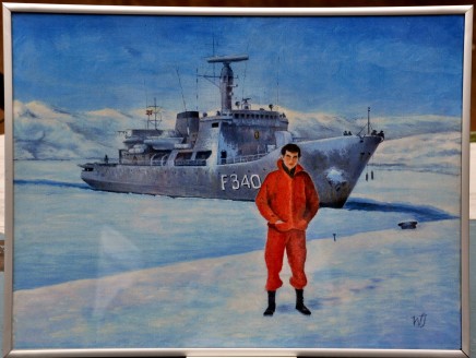 Mens museets frivillige forleden var i gang med rengøring, kom Poul Kirketerp forbi. Ikke for at se vore udstillinger, for det ved han godt, ikke kan lade sig gøre lige nu - men for at aflevere et flot maleri af skoleskibet "København". Billedet er signeret F. Nyborg.