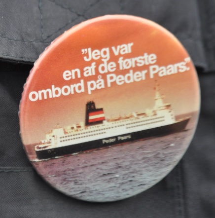 Flemming Johansen var virkelig en af de første ombord på "Peder Paars", og indtil i lørdags pralede han af det ved at bære denne badge. Han bærer den ikke mere, nu befinder den sig hos Aarhus Søfarts Museum.