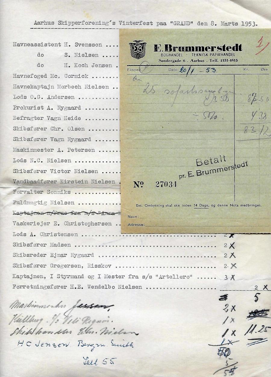 Udover mapperne med akvareller modtog vi en del andre arkivalier, hvoraf en del stammer fra Aarhus Skipperforening. Sjovt synes vi det var at finde regningen for køb af 25 eksemplarer af Sømandssangbogen: 5 % i rabat. Kvitteringen ligger oven i listen over deltagerne i Aarhus Skipperforenings vinterfest på Grand i 1953. Mon ikke navnene på denne liste fremkalder mange minder hos havnens ældste i dag?