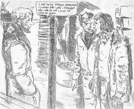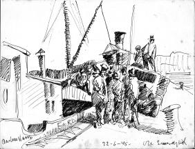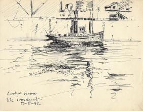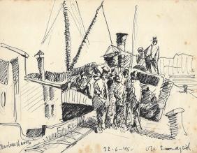 Vi lægger ud med at vise nogle få Stoltenberg-tegninger fra samlingen samt et billede af Rasmus Rasmussen med sin køjesæk, siddende på en pullert - formentlig i forbindelse med en udmønstring.