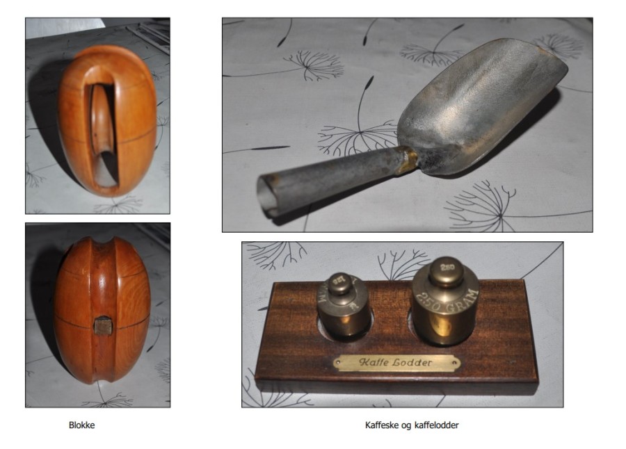 To fint forarbejdede blokke er blandt effekterne sammen med en kaffeske og to kaffelodder på hhv. 1/8 kg (125 gram) og 1/4 kilo (250 gram).