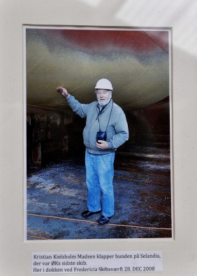 Bent Mikkelsen havde fundet et fotografi af Kristian Kielsholm Madsen. Billedet er taget i Fredericia, hvor Kielsholm Madsen står i dokken ved ØKs sidste skib (af fire) med navnet "Selandia".